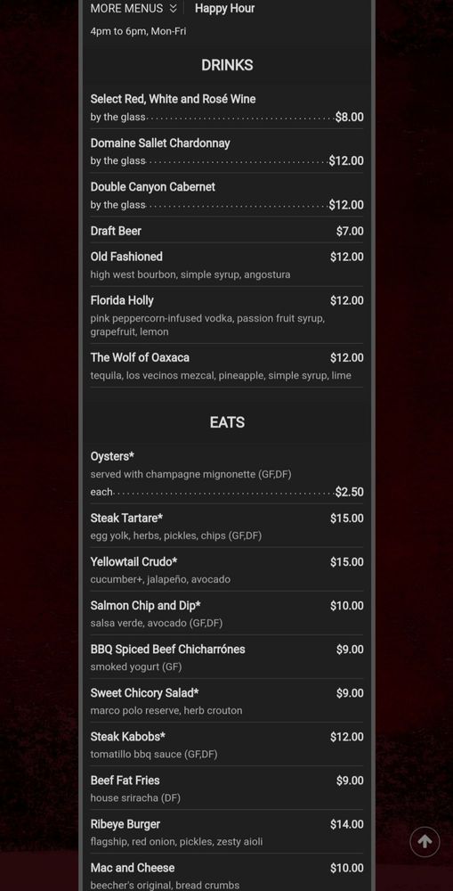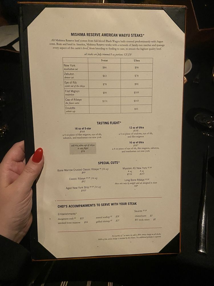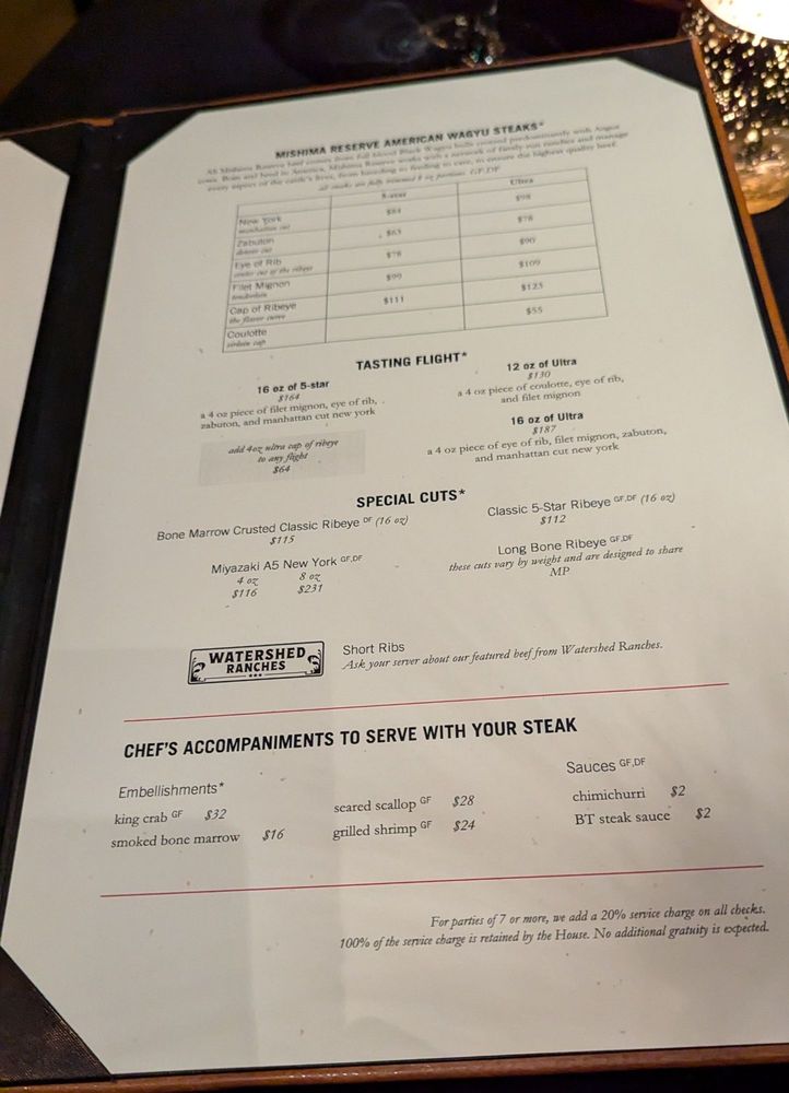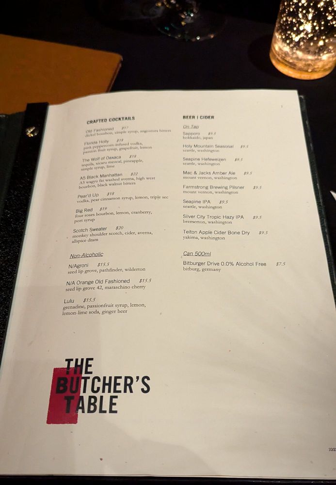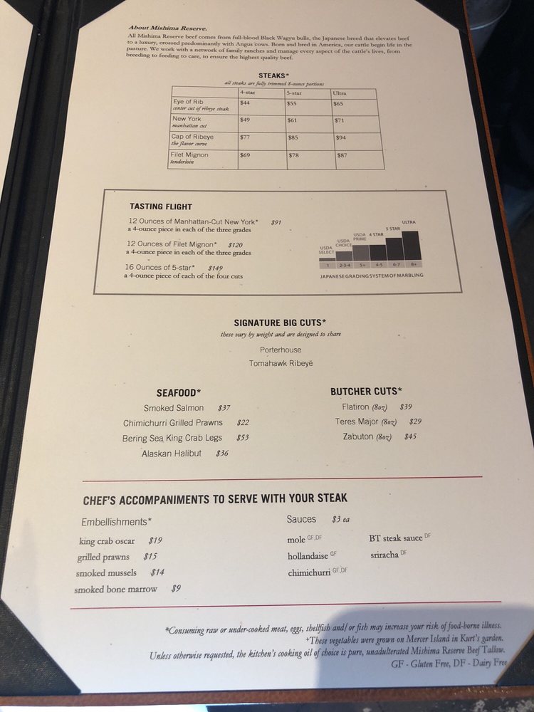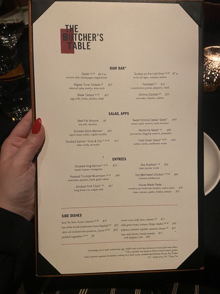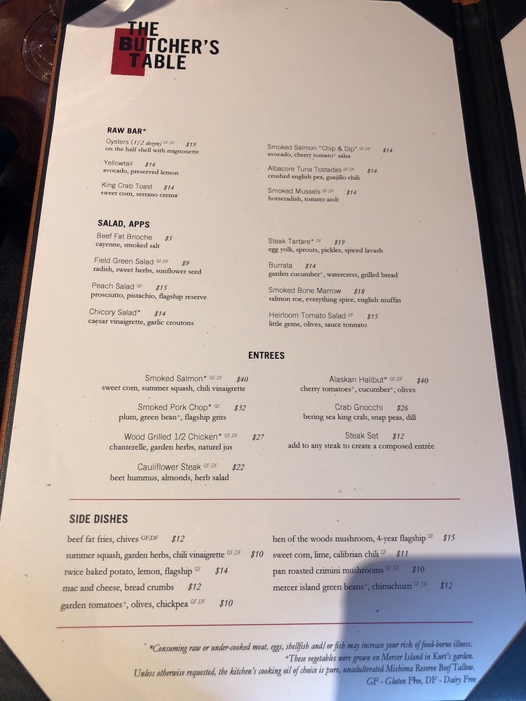 Introducing the menu at The Butcher's Table in Seattle, WA. This upscale steakhouse offers a variety of options catering to different dietary preferences, including Keto, Pescatarian, and Vegan. From the raw bar with oysters and tuna to savory entrees like Smoked King Salmon and Roasted Trumpet Mushroom, each dish is crafted with attention to detail and flavor. Customers rave about the A5 strip and filet, highlighting the impeccable preparation and mouthwatering taste. Sides like Mac and cheese with king crab and beef fat fries complement the steaks perfectly. The ambiance is described as elegant and inviting, making it ideal for special occasions or intimate dinners. Service is top-notch with attentive staff ensuring a memorable dining experience. Whether it's a romantic date or a celebratory meal, The Butcher's Table promises a delightful culinary journey worth savoring.