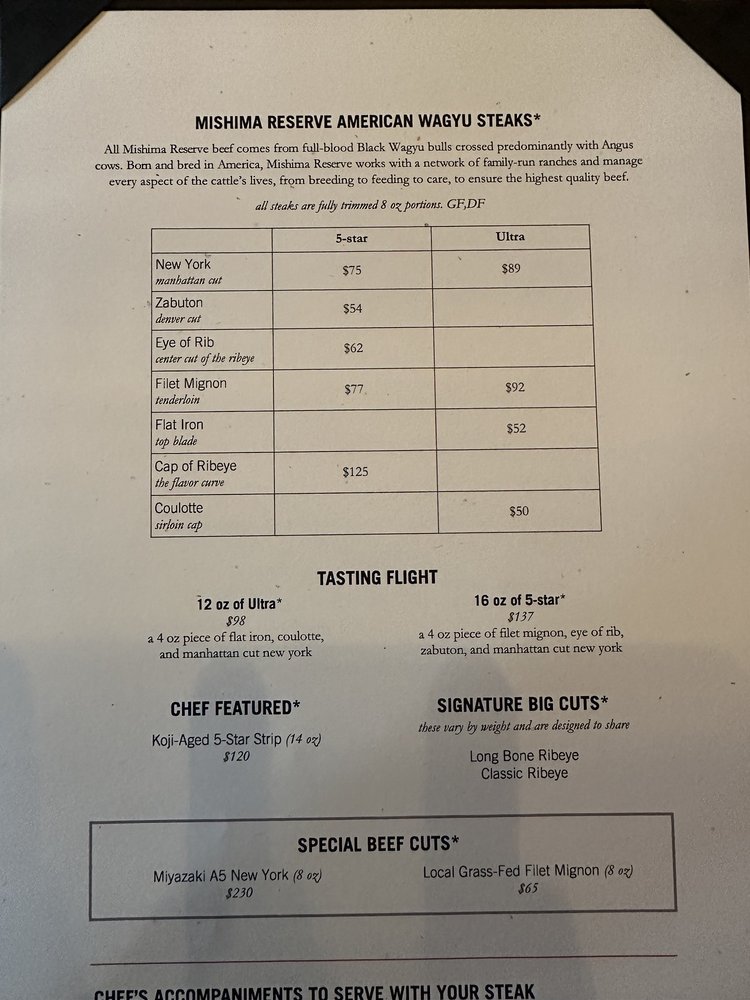a 4 oz piece of eye of rib, filet mignon, zabuton, and manhattan cut new york